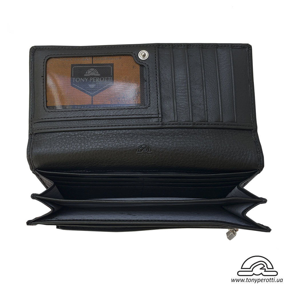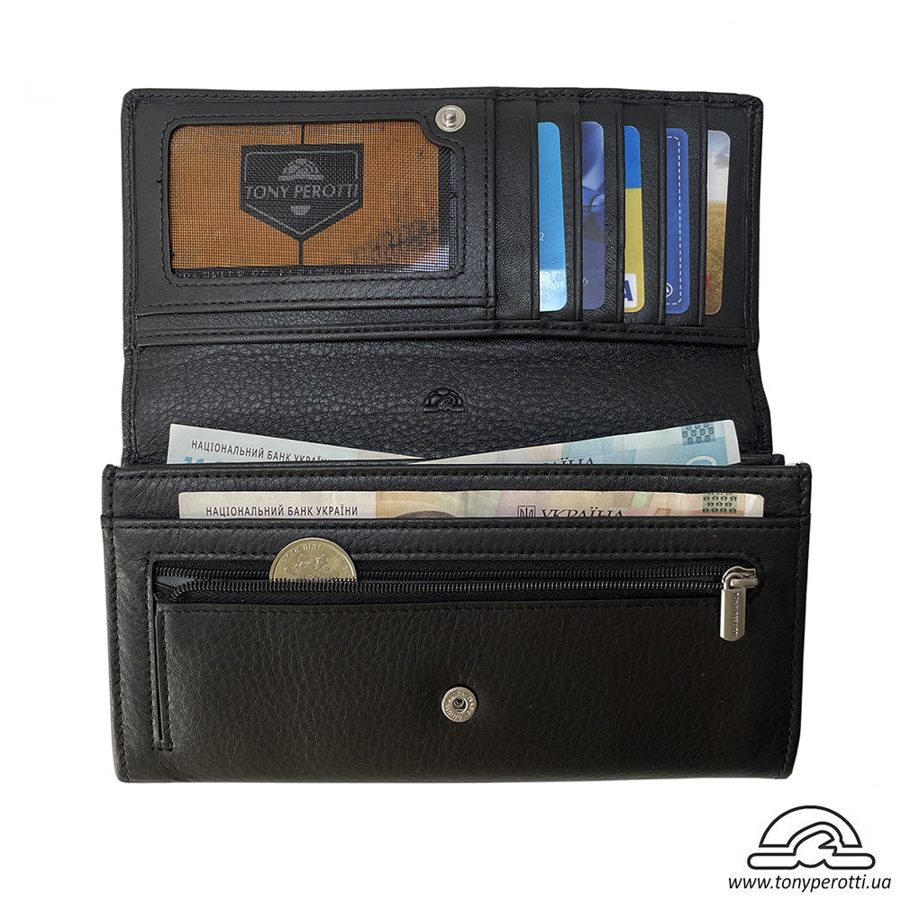 Классический женский портмоне имеет 2 вместительных отделения на полную купюру без сложения, 2 дополнительных отсека, монетницу на молнии, 7 слотов для пластиковых карт на клапане плюс кармашек с прозрачной сеточкой для документов, скрытый карман на полную купюру. Во втором основном отделении для купюр размещены еще 6 слотов для карт. Снаружи на тыльной стороне кошелька открытый потайной карман на всю длину портмоне. Внутри - тиснение Tony Perotti, снаружи - обновленный выпуклый шильдик с черепашкой. Подкладка брендированная бежевого цвета, голограмма с логотипом фирмы.