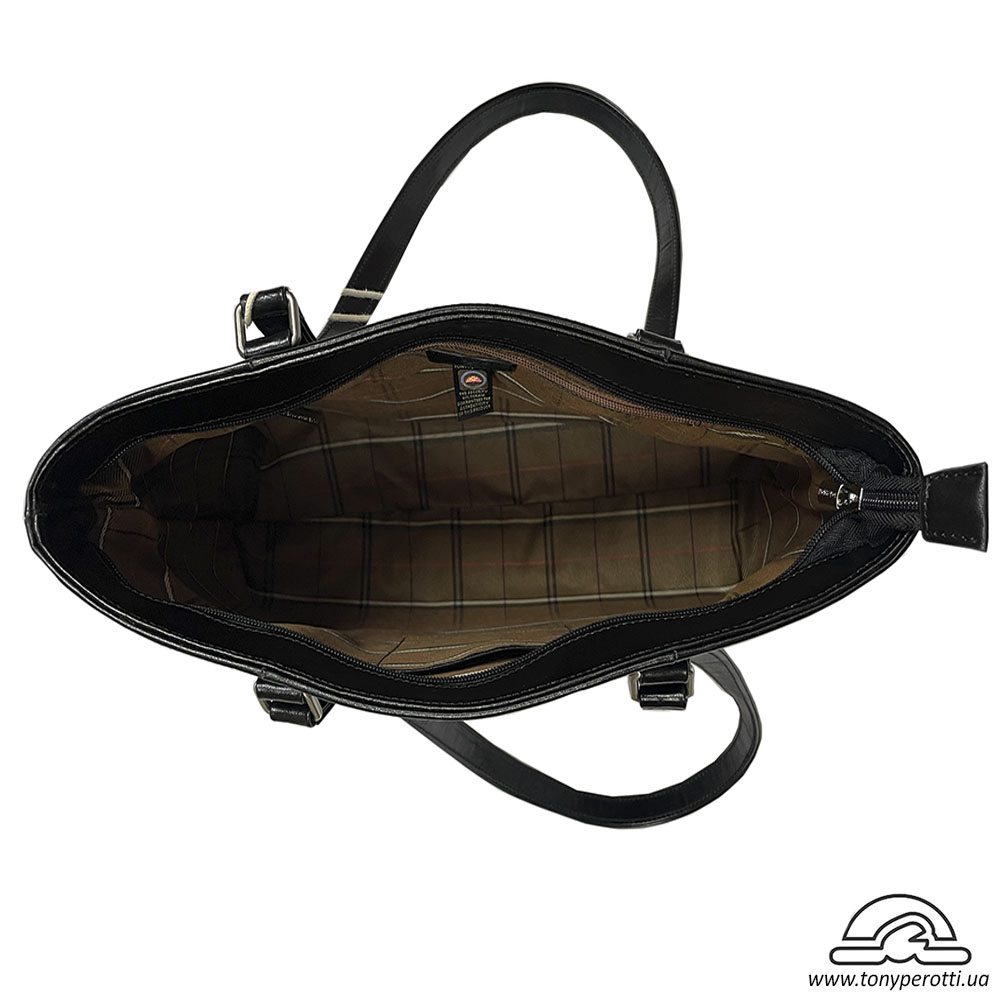 Елегантная сумка имеет основное отделение на молнии, внутри расположен с одной стороны дополнительный кармашек на молнии, с другой стороны кармашки для телефона, карточек, ручек; шелковая брендированная подкладка, голограмма подлинности. На фронтальной части сумки тиснение фирменная черепашка, на тыльной стороне тиснение надпись tony perotti. Длинные ручки позволяют носить сумку как в руках, так и на плече. В данную модель сумки вы можете поместить как небольшой ноутбук, так и деловые бумаги формата А4.